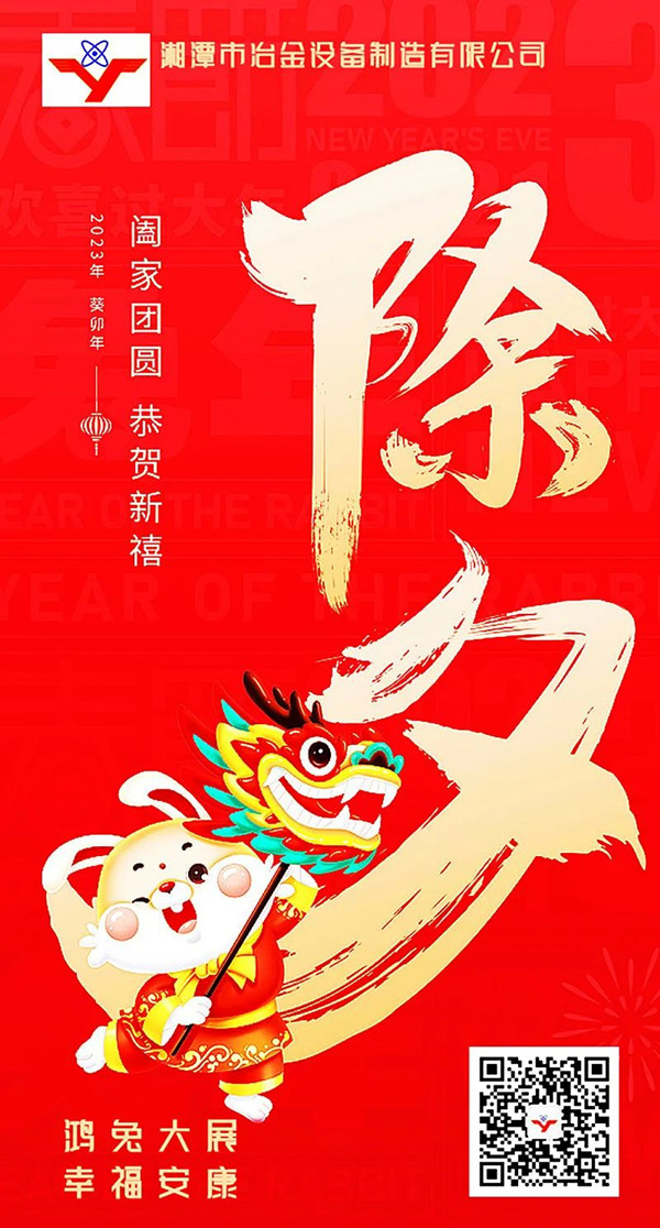 ”爆竹聲聲一歲除,歡天喜地迎新春“。在震天的鞭炮聲中,在滿天璀璨的煙花里,我們與2022揮手告別,與嶄新的2023年深情相擁……陪伴是最深情的告白,相守是最溫暖的承諾。除夕之夜,最大的幸福莫過于和家人團(tuán)聚,最大的快樂莫過于陪父母長(zhǎng)輩談心,最好的祝福就從湘潭市冶金設(shè)備這里傳遞……值此農(nóng)歷除夕到來之際,國(guó)內(nèi)冶金礦山設(shè)備非標(biāo)定制專家——湘潭市冶金設(shè)備制造有限公司衷心祝愿所有客戶、伙伴、朋友、家人們:除夕團(tuán)圓! 新年歡喜!鴻兔大展! 萬事如意!祝天下所有父母:健康長(zhǎng)壽,平平安安!祝天下所有家庭:溫馨和睦,幸福美滿!